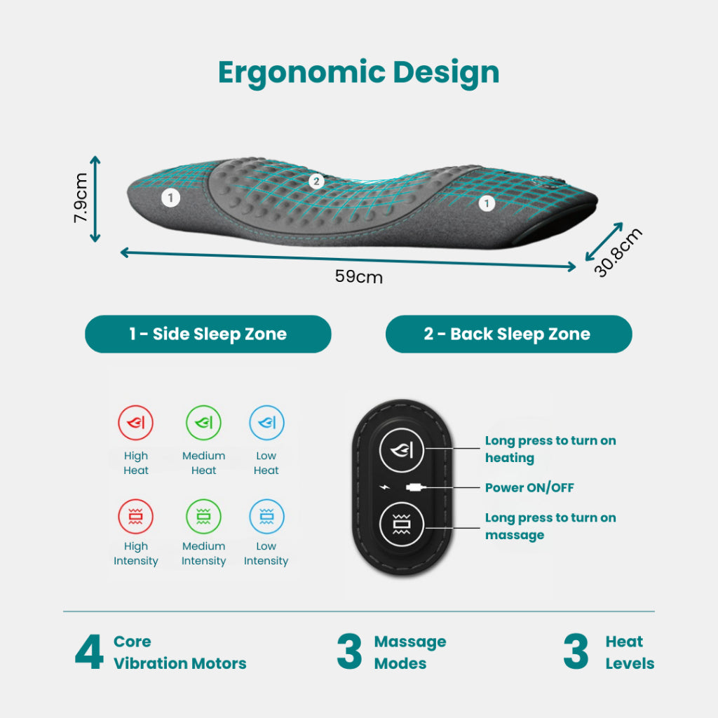 With its ergonomic build, multifunctional massage and heating features, and premium-quality materials, the Spinalmate Lumbar Massage Pillow is a game-changer for restful sleep and spinal care. Pair it with our SpinalBack and SpinalSeat for all-day, full-spine wellness.